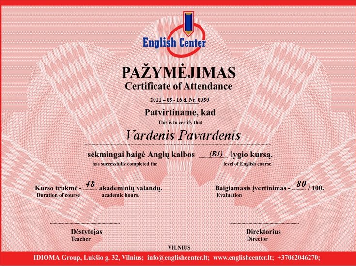Pabaigus “English Center” kursus ir išlaikius baigiamąjį lankytų kursų egzaminą, išduodamas baigimo pažymėjimas, kuriame nurodomas mokymosi lygis, kursų trukmė akad. valandomis, įvertinimo balas 100 balų vertinimo skalėje.